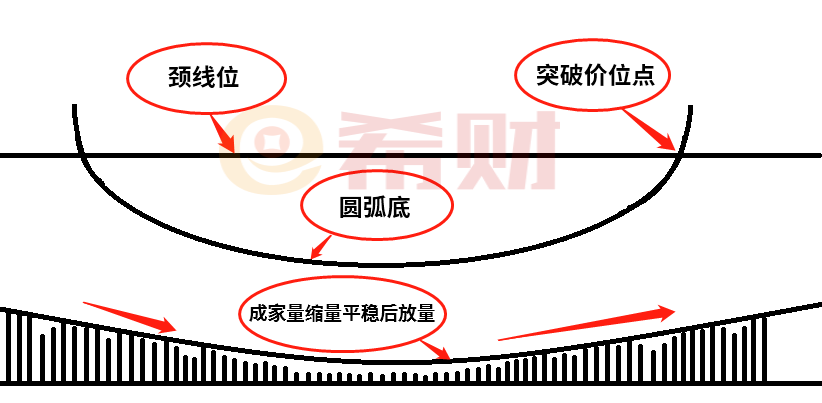 圓弧底是一種較為弱勢行情的圖形體現,是盤面調整性圖形、關注突破買點性圖形和轉勢反彈圖形。形成的條件是由標的較為長期的價格下降,通過時間市場消化空方力量后,出現低位震蕩。等到低位調整穩定后,多方資金進入帶動成交量,使標的上漲活躍性加強。圓弧底圖形是通過下跌趨勢,箱體調整趨勢和上升趨勢組成。(如下圖所示)
