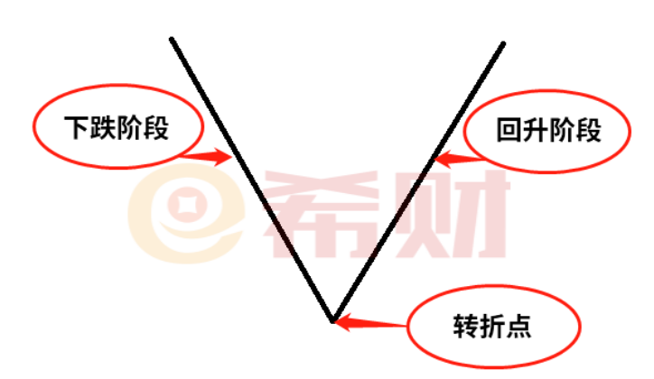 V字形反轉圖形是一種市場戲劇化的走勢圖形。顯示市場空方力量強大使股價持續性下跌,當在一定的價位空方力量逐步被市場消化,多方力量快速掌握主導權,突發的反轉圖形。V字形反轉圖形是由下跌階段、回升階段和轉折點組成。(如下圖所示)