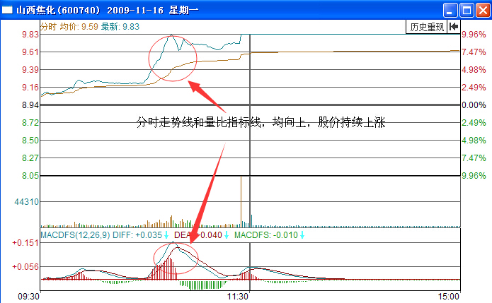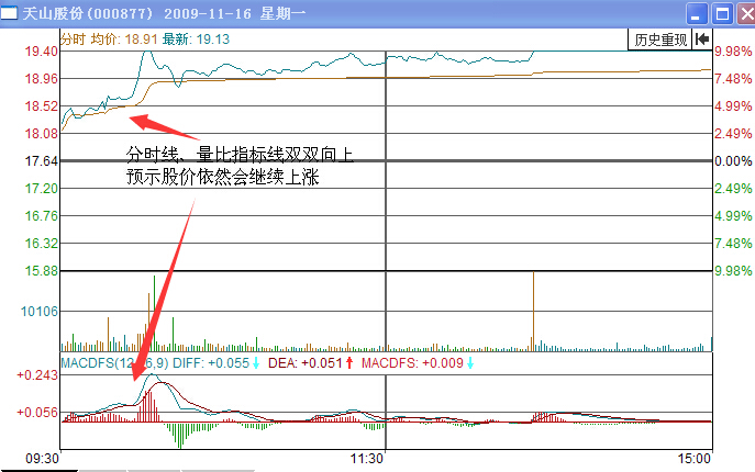 實例一:天山股份在2009年11月16日的分時走勢圖,顯示股價在開盤之后出現了快速上漲的走勢,而且其分時線的形態非常的強勢,結合成交量變化的分析,(文章來源贏家財富網,轉載請注明出處,www.yingjia360.com)在股價上漲的時候,量比指標線也形成了上升的趨勢,這樣在同一時間內,分時線與量比指標保持了一致的方向,就是雙向向上的現象。