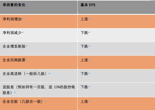其中大家可以看到,基本EPS主要是受到兩個因素影響的,第一是凈利潤,第二則是普通股數量。當凈利潤增加了,普通股數量不變,那基本EPS也會增加。而普通股的數量則會受到以下幾個因素影響:增發、高送轉(一股拆成多股,但總價值不變,但每股價格下降)。因為這幾種行為會增加加權平均普通股數量,在凈利潤不變的情況下,基本EPS會因為以上幾種情況而降低。