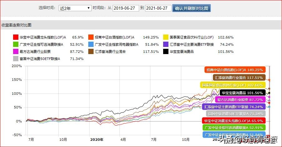 近2年基金歷史走勢中,依然招商中證白酒獨領風騷,匯添富消費行業第二但業績差距較大超30%,之后國泰國證食品飲料,華寶寶康消費品迎頭趕上。依然是兩只可選消費指數基金在后面。