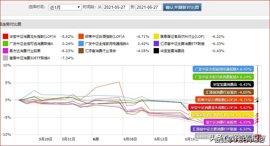最后看一下短期近1月走勢,廣發的家用電器、可選消費和華寶寶康消費名列前三,富國消費50和匯添富中證主要消費落后且調整幅度較大。