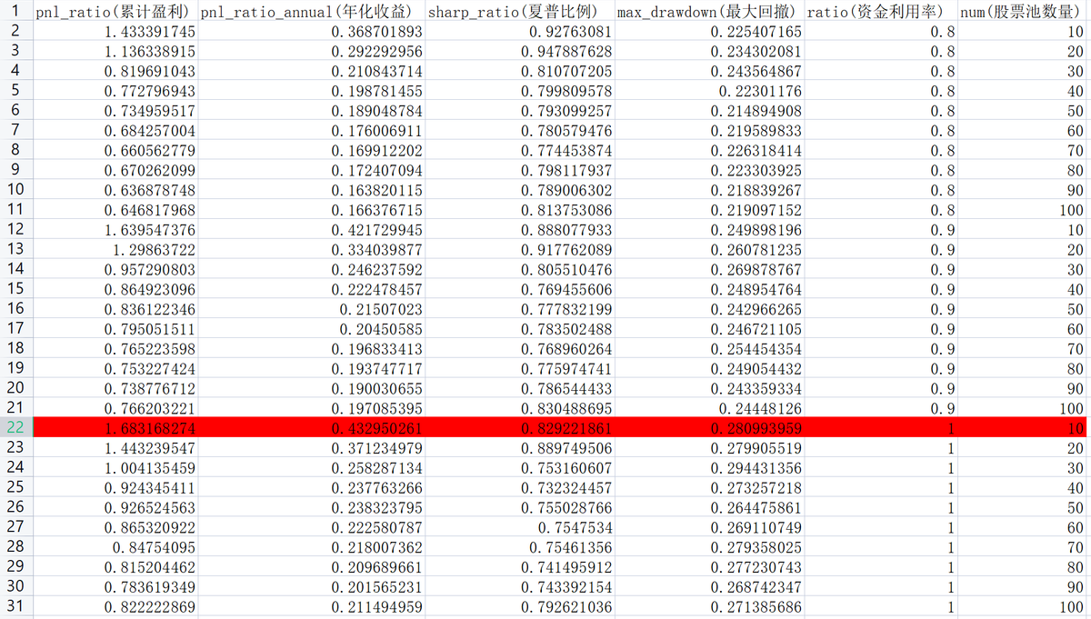 這個回測總共有30種組合,我開啟12個線程同時開跑,也足足花了我5個多小時才跑完這么多回測,程序跑完后會生成一個結果文檔,30種組合的累計盈利率和年化收益等數據一目了然: