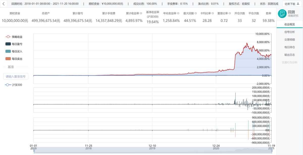 從2018年1月1日至2021年11月20日,累計收益率為969.12%,年化收益率249.28%,回撤也是最大的56.21%。