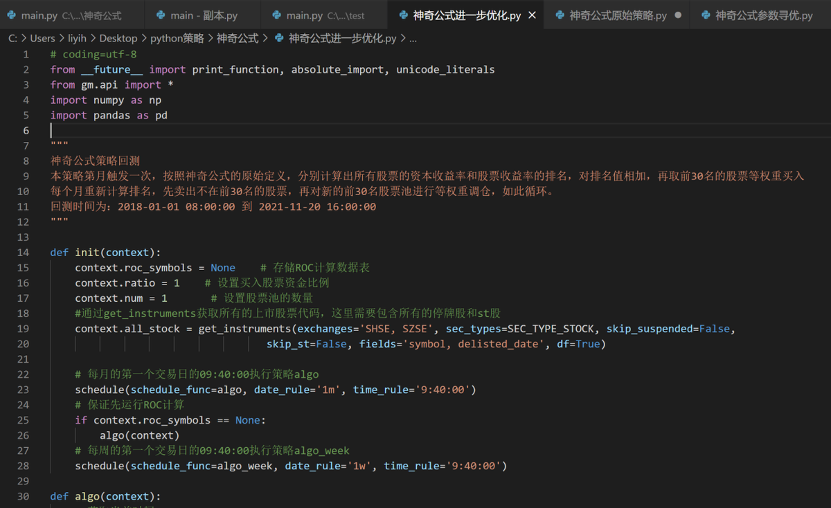 公式說起來簡單,但是真的要收集數據計算一遍還是很復雜的,好在我們有計算機幫忙整理數據和計算,這里用掘金量化平臺的python語言編寫程序,假定掘金量化平臺獲取到的相關財務數據都是準確可信的,根據神奇公式的計算方法,編寫策略代碼如下: