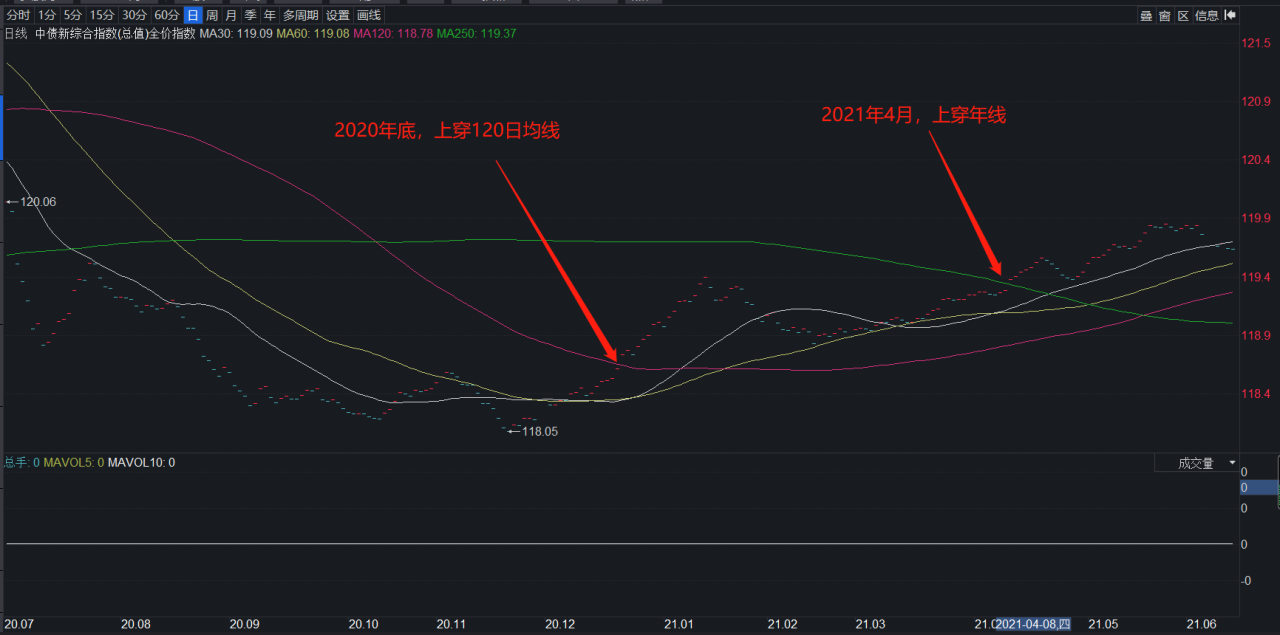 這是一個技術指標,當中債指數上穿120日均線時,大概率債券牛市的趨勢已經形成。