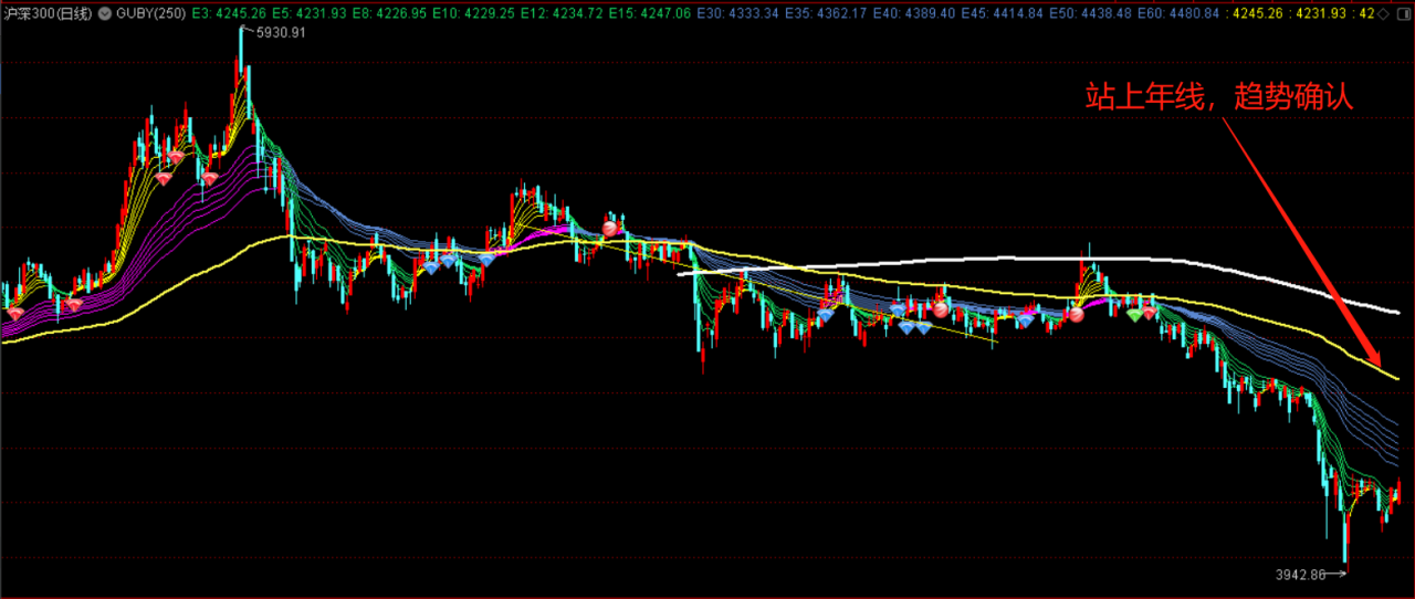 如果你是一個做趨勢的,那么還有一個指標值得注意,那就是滬深300上穿年線,也就是圖中那根黃色的線。