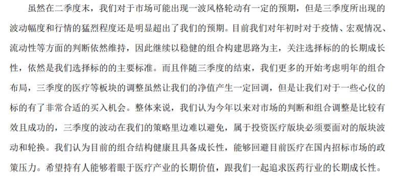 整體來說,我們認為今年以來對市場的判斷和組合調整是比較有效且成功的,三季度的波動在我們的策略里邊難以避免,屬于投資醫療版塊必須要面對的版塊波動和輪換。我們認為目前的組合結構健康且具備成長性,能夠回避目前醫療在國內招標市場的政策壓力。