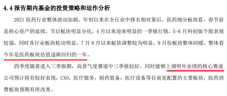 基金致力于探尋最符合醫藥產業發展趨勢的高景氣優質公司,四季度將繼續基于產業趨勢的深度研究,沿著高景氣主線,努力持續挖掘業績增速與估值相對匹配的公司作為重點投資對象。