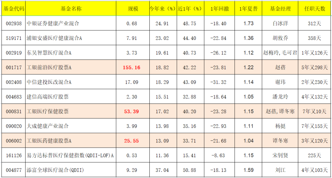 工銀的3只醫藥基金都榜上有名,也是這幾只基金中規模居前的: