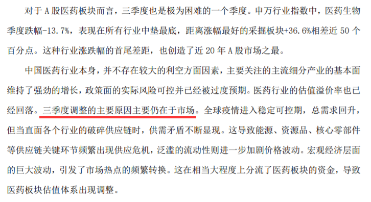 三季度所出現的波動幅度和行情的猛烈程度還是明顯超出了我們的預期。伴隨三季度的結束,我們更多的開始考慮明年的組合布局,三季度的醫療等板塊的調整雖然讓我們的凈值產生一定回調,但是讓我們對于一些心儀的標的有了非常合適的買入機會。