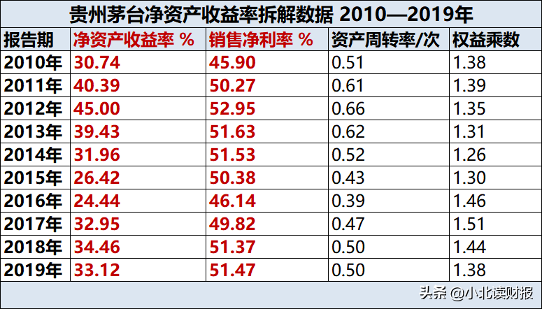 貴州茅臺凈資產收益率拆解數據 2010—2019年