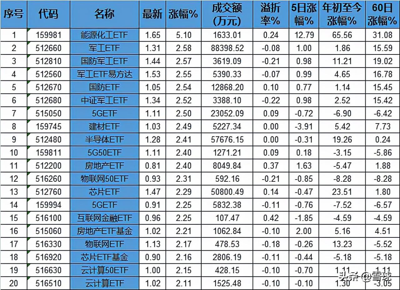 #ETF每日排行榜# 三大指數今日沖高回落,但個股普遍上漲,兩市有超3000多股收漲;滬深兩市成交額連續第45個交易日超過1萬億元,繼續刷新最長歷史紀錄。從盤面上,造紙、鴻蒙、工程、綠色電力等板塊漲幅前列,磷化工、有機硅、PVDF、煤化工等板塊跌幅居前。截止收盤,滬指漲0.38%,深成指漲0.77%,創業板指漲0.57%。北向資金全天凈賣出43.09億元,其中滬股通凈賣出38.15億元。