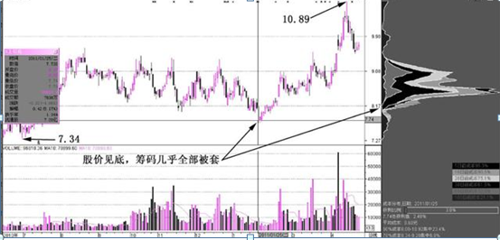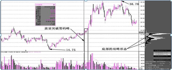 個股在見底回升,并且拉升的單峰籌碼前,出現了圖中所示的籌碼分布形態。頂部巨大籌碼峰中,下面還存在一個籌碼峰形態。這樣看來,股價在前期的調整,在這個時候已經差不多完成了。圖中出現的放量突破的走勢,就是投資者開始介入該股的時刻了。量能放大之后,頂部的巨大籌碼峰已經不算什么阻力了。該股將會在放量的過程中,持續走出放量沖高的行情。圖中巨大籌碼峰,是莊家洗盤后的結果,被放量突破的時刻必然是莊家建倉的時機。