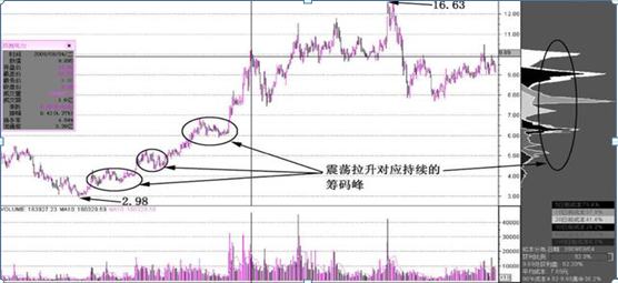 股票的日K線中,股價被拉升的過程,顯然是波動上攻的。并且從籌碼分布情況來看,顯然是比較明顯的持續出現峰值的走勢。該股在被拉升過程中的每一個高位,都對應著出現一個籌碼峰值。而股價的運行趨勢,就是沿著籌碼峰值的變動而出現的。對于這種波動中被拉升的股價,投資者應該使用少量資金來做短線的操作,而用多數資金來做長線的投資。