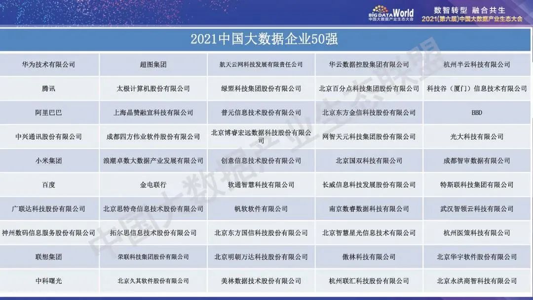日前,“2021中國大數據企業50強”在第六屆大數據產業生態大會上正式揭曉。其中,華為、騰訊、阿里、中興、小米分別位列榜單前五。評選結合企業研發投入力度、創新能力、產品及方案成熟度、投資及發展潛力等多個維度,設置評價指標體系,覆蓋中國大數據產業生態鏈上的細分領域,并對大數據全產業鏈進行產業結構分析,梳理各領域大數據龍頭企業。通過調研評選出的“中國大數據企業50強”作為大數據產業發展的領軍企業,將成為中國數字經濟國家戰略建設的中堅力量。