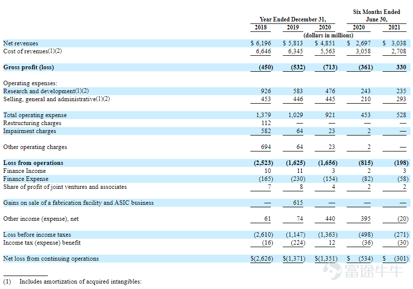 2018年-2020年,格芯營收分別為61.96億美元、58.13億美元、48.51億美元,凈虧損分別為26.26億美元、13.71億美元和13.51億美元,營收下降的同時虧損也有所縮減;