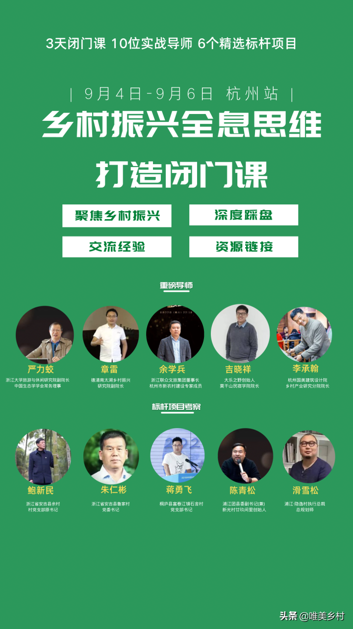 總之,他山之石可以攻玉,浙江堅持農業農村優先發展,在鄉村振興工作體系、推進機制等方面先行先試、大膽探索、創新實踐,各地涌現一批有思路、有打法、帶動效應強的浙江經驗,無疑是我們最好的學習榜樣。為此,我們推出“鄉村振興全息思維閉門游學課程”,為期三天深度踩盤、交流經驗、沉浸式學習體驗,掌握鄉村振興的打造心法!