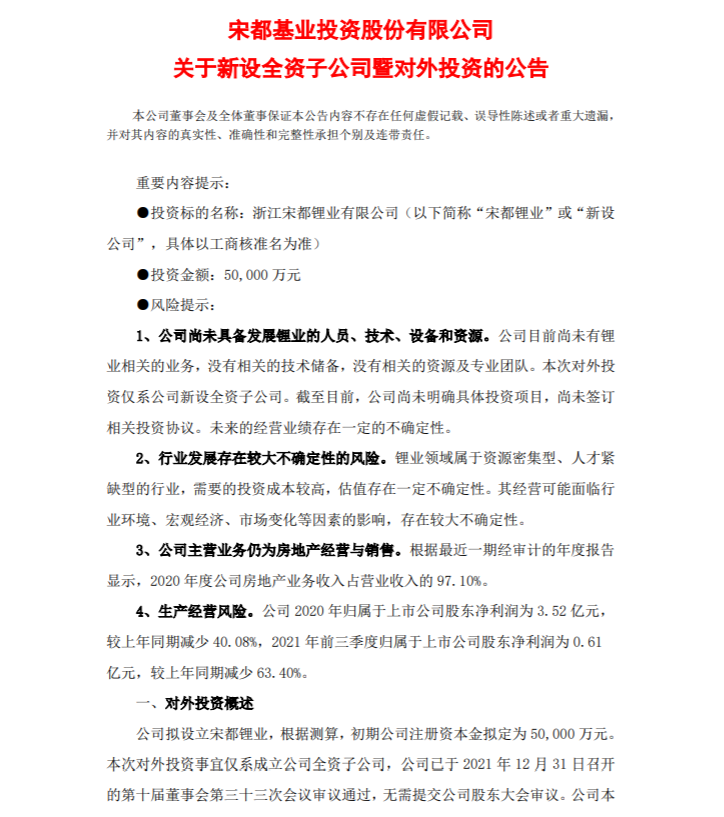 今年1月4日晚,宋都股份發布公告稱,擬成立子公司浙江宋都鋰業有限公司,初期注冊資本金擬定為5億元。