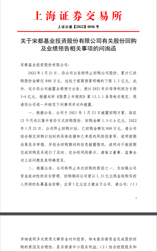 1月23日,上交所在給宋都股份的《問詢函》中提到:“回購期間公司曾以1.31億元現金收購實控人所持的私募基金份額、出資5億元設立鋰業子公司。請詳細說明多次使用大額資金對外投資,卻未能安排資金完成股份回購的原因及合理性,是否損害中小股東利益?”