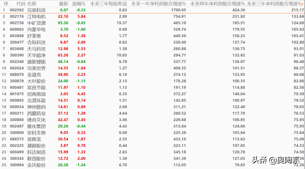 其中未來三年凈利潤復合增速超過100%的有六家。分別是兄弟科技,江特電機,中礦資源,內蒙華電,好萊客,合縱科技。兄弟科技股價近10個月累計上漲77%(從2021年7月最低3.43元每股上漲至目前的6.07元每股),江特電機股價近兩年累計上漲17倍(從2020年5月最低1.25元每股上漲至目前的22.10元每股),中礦資源近兩年累計上漲571%(從2020年5月最低14.0元每股上漲至目前的95.3元每股),內蒙華電近9個月累計上漲64%(從2021年8月最低2.25元每股上漲至目前的3.7元每股),中礦資源近兩年累計上漲571%(從2020年5月最低14.0元每股上漲至目前的95.3元每股)。