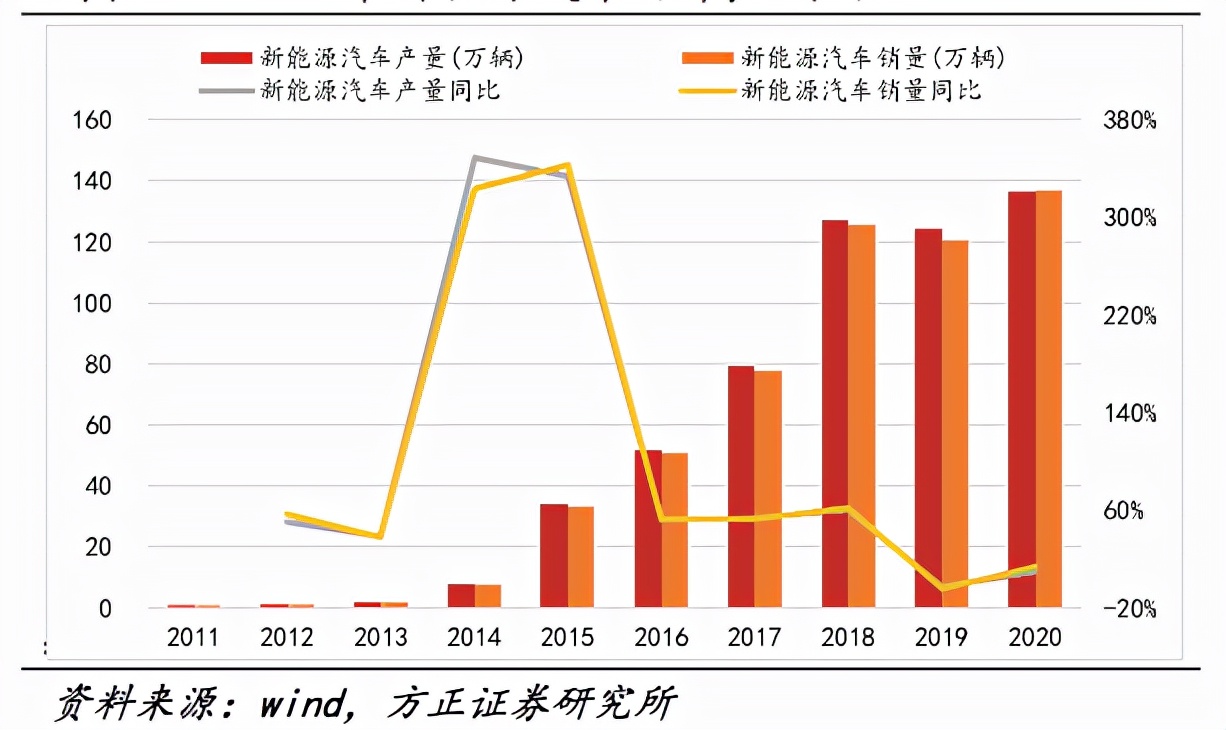 同樣是方正證券的研究報告顯示,新能源汽車的產銷量這兩年達到了巔峰。2021年1-12月新能源汽車產銷分別完成354.5萬輛和352.1萬輛,同比分別增長159.5%和157.5%,這個超高增速,給汽車市場帶來了福音,預期到2025年新能源汽車在汽車總銷量總占比20%,2030年達到40%以上,2035年到達50%以上。