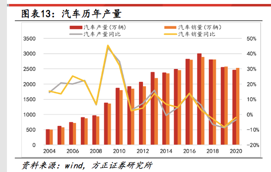 通過的研究報告可以發現,過去將近20年的時間里,汽車的產量持續上漲,到了2017年汽車的產銷量達到了一個頂峰,當年汽車的產銷量都接近3000萬輛,雖然這些年受到經濟調整期的影響,汽車產銷量都快速下滑了,但是最近兩年受到新能源汽車的大力發展,目前汽車的產銷量開始快速提升:
