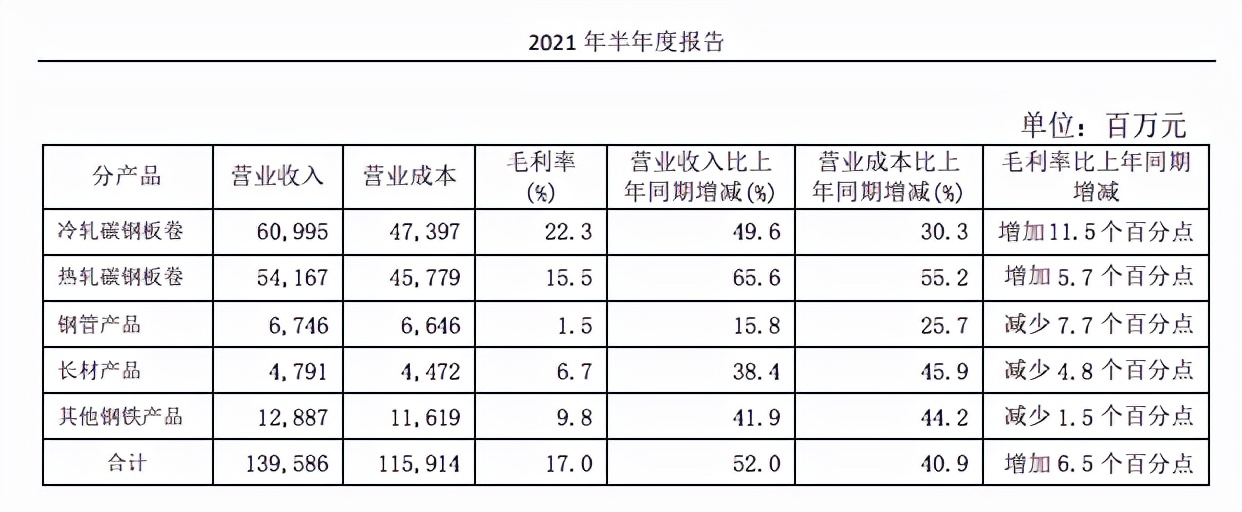 汽車用鋼量是比較大,鋼材在汽車總重量中所占比例為70%左右,汽車用鋼主要是冷軋鋼板和熱鍍鋅鋼板,以及部分熱軋碳鋼板,因此從寶鋼的主營業務產品上,可以發現: