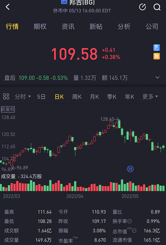 展望:Bunge將調整后的22財年每股收益預期上調至至少11.50美元(之前的觀點至少9.50美元),而此前的共識為11.04美元