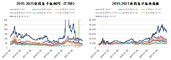 由于初始估值較高和交易較為擁擠,2021年醫藥指數整體呈寬幅震蕩態勢,中信醫藥指數2019年上漲38.2%,2020年上漲50.4%,2021年下跌4.4%。2021年指數經歷兩次大幅回調:第一次是2月下旬至3月上旬,主要是前期漲幅大、估值高的機構重倉股回調較多,之后修復圍繞一季報行情展開,龍頭個股重回高點;第二次為7-8月的回調,始自教培行業整頓,隨后醫藥板塊政策密集且負向超預期,包括部分省份IVD集采、創新器械集采、種植牙集采、腫瘤藥臨床指導原則等,進一步加劇板塊性恐慌。隨后的9-12月,醫藥板塊橫盤震蕩,未見三季報行情與年底估值切換行情。