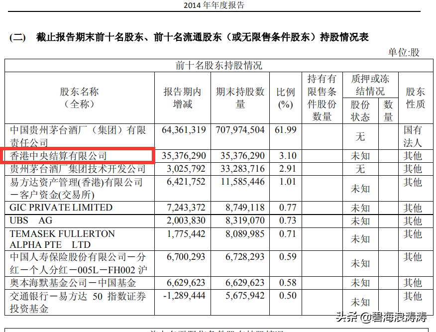 2014年年報顯示,“ 香港中央結算有限公司 ”買入茅臺股票并進入第二大股東的時候,中央匯金,中國證金,奧本海默基金公司等投資機構均未進入茅臺的前十大股東名單。