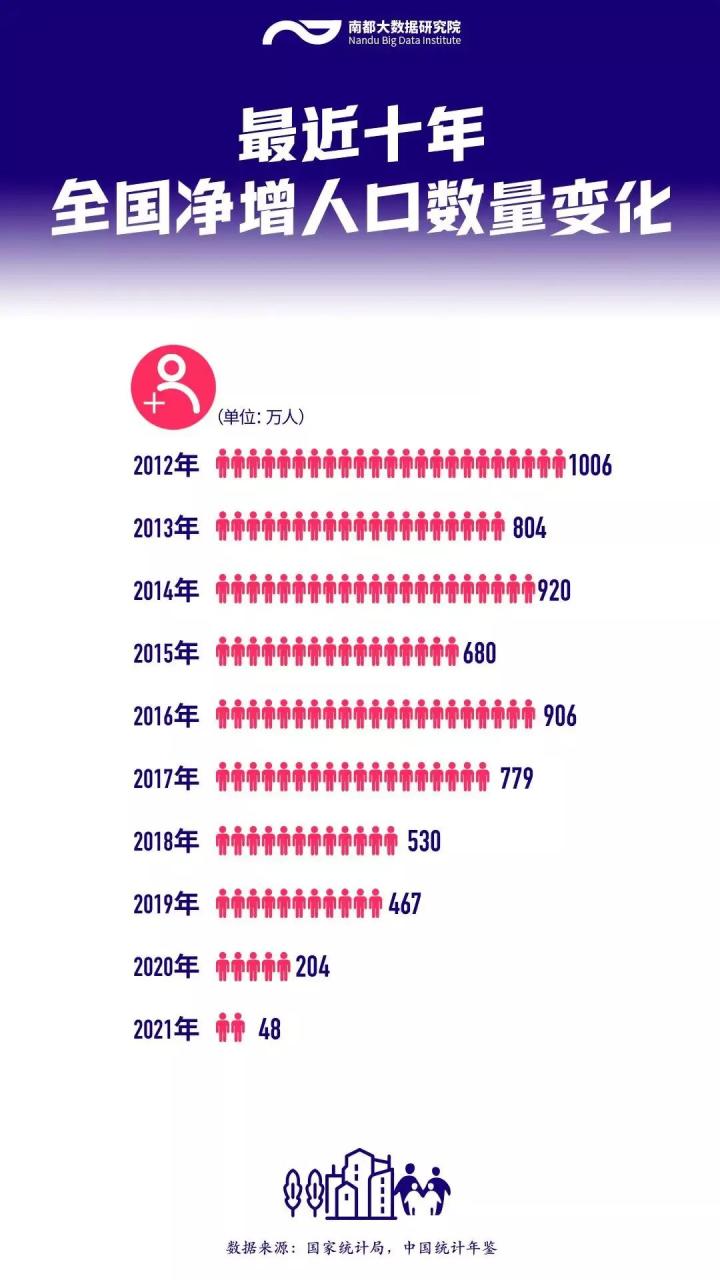最新統計學數據顯示,2021年,全國人口增加了48萬人,比前一年少增長了150多萬。而九年前的2012年,人口增長則超過了1000萬人。也就是說,十年之間,全國凈增人口數量減少了95.23%。
