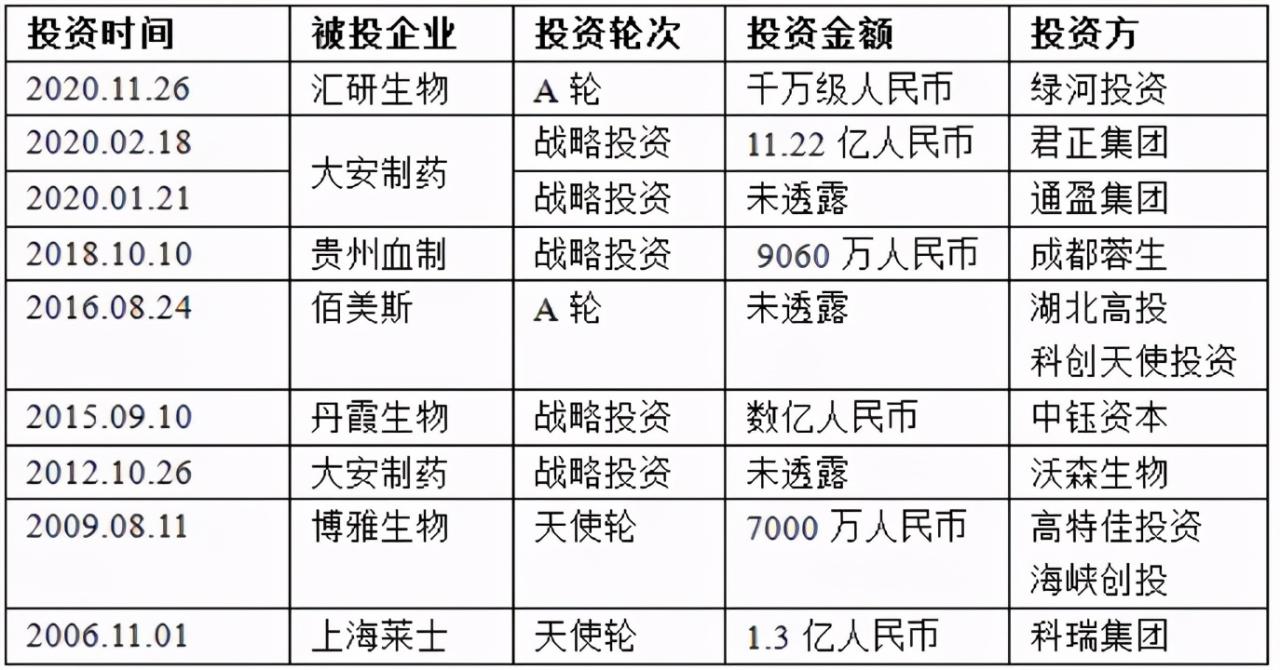 我國血液制品行業投融資事件數量比較少,2006年至今投融資事件總數合計為9起,其中2020年就有三起。2020年1月和2月,大安制藥分別得到通盈集團和的戰略投資,通盈集團對其投資金額暫未披露;君正集團對其戰略投資金額高達11.22億人民幣,占大安制藥增資擴股后注冊資本的31.17%,這是君正集團由化工產品向生物制品跨界整合的一項重大舉措,也是血液制品行業投資金額最大的一次投融資事件。2020年11月,匯研生物完成千萬級A輪融資,投資方為綠河投資,融資所得主要用于新建生產線。