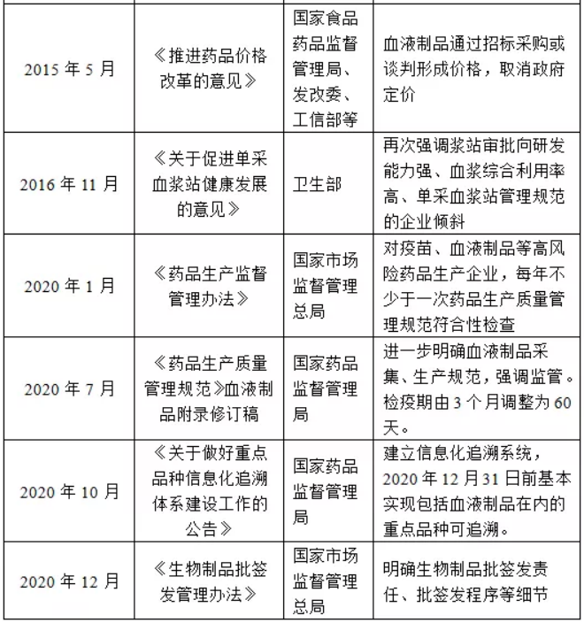 在血液制品定價方面,2015年,國家食品藥品監督管理局聯合衛生部、工信部等部門發布《推進藥品價格改革的意見》取消了一直以來的政府定價,提出血液制品通過招標采購或談判形成價格,推進血液制品價格市場化進程。在血液制品信息化方面,2020年,國家藥品監督管理局發布《關于做好重點品種信息化追溯體系建設工作的公告》,提出建立包括血液制品在內的藥品信息化追溯系統,提升血液制品信息化管理程度。