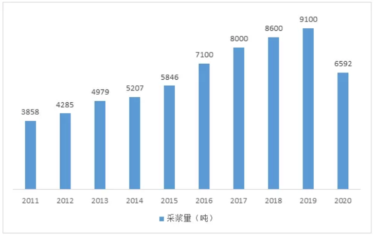 2011-2019年,我國血漿采集量呈現逐年增長趨勢,2019年采血量達9100噸,同比2018年增長5.8%。2020年,由于新冠疫情導致人們無法外出獻血,全年采漿量為6592噸,較上一年下降較大。