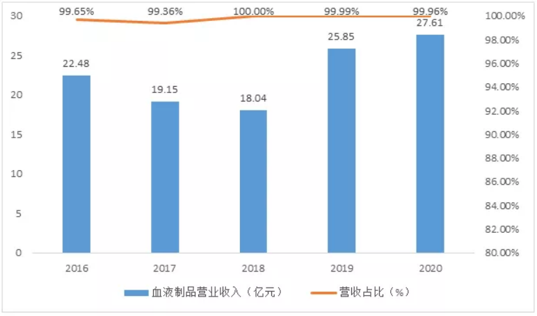 采漿量方面,根據公司年報,面對國內新冠疫情影響,公司各項工作穩步開展,血漿事業穩中有進,公司全年采漿量達到1200余噸。(3)血液制品業務情況血液制品營業收入方面,2016-2020年,上海萊士營業收入表現為先下降后上升趨勢。2020年實現血液制品營業收入27.61億元,較2019年同比增長6.8%;2016-2020年,上海萊士血液制品營收占比保持在99%以上,表明血液制品為公司唯一的主營業務。