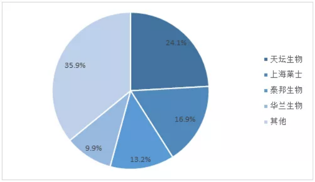 2020年一季度,我國新冠疫情爆發。北京協和醫院關于“新型冠狀病毒感染的肺炎”診療建議方案V2.0中提到,重癥患者依據病情可酌情早期使用IVIG 0.25g/kg/d,療程3-5天,由此帶來靜丙需求量的快速增長。在靜丙生產企業中,天壇生物靜丙批簽發量最多,2020年批簽發占比為24.1%,第二、三、四分別為上海萊士、泰邦生物和華蘭生物。四家企業累計市占率達到64.1%,對我國靜丙的批簽發趨勢起到重要作用。