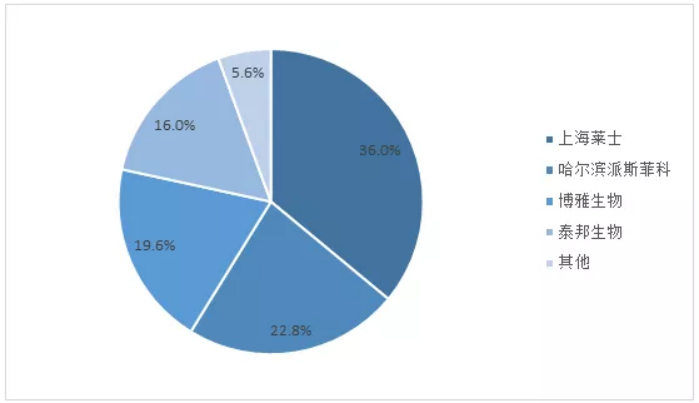 人纖維蛋白原主要生產企業包括上海萊士、哈爾濱派斯菲克、博雅生物和泰邦生物等,其中上海萊士市場占有率最高,占比達36.0%,哈爾濱派斯菲科僅隨其后,市場占有率為22.8%,博雅生物排名第三,市場占有率為19.6%。