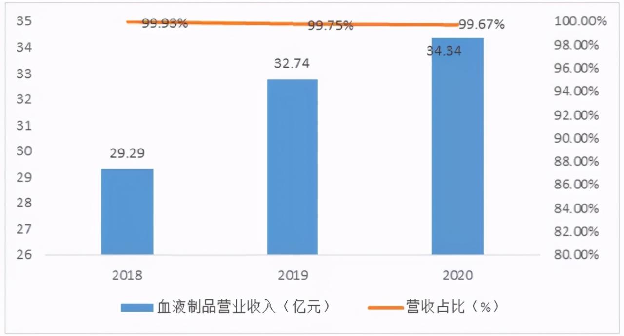 血液制品營業收入方面,2018到2020年,天壇生物營業收入逐年增長,且血液制品營業收入占總收入比重保持在99%以上,2020年血液制品營業收入為34.34億元,較2019年增長4.9%,占總營業收入比重為99.67%。