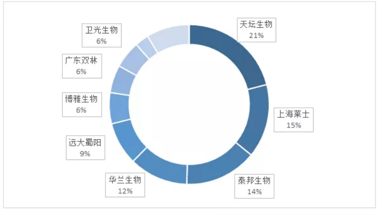 國產白蛋白方面,天壇生物占據最大市場份額,市占率達21.0%,上海萊士緊隨其后,排名第二,市場占有率為14.9%。泰邦生物和華蘭生物分別居第三和第四位,市場占有率分別為14.6%和11.9%,僅這四家企業市場占有率合計達62.4%,國內白蛋白市場集中度較高。