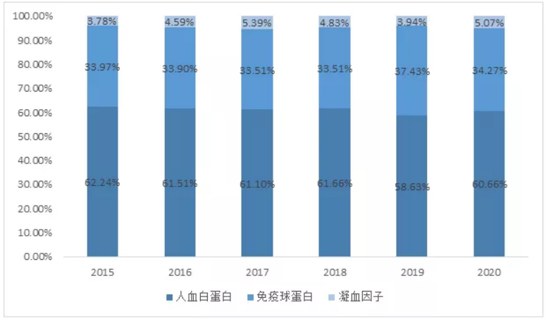 血液制品主要包括人血白蛋白、免疫球蛋白和凝血因子三大類,從這三類主要產品的批簽發量分布來看,人血白蛋白批簽發量占比最多,占比超過60%,免疫球蛋白次之,凝血因子占比最小。2020年人血白蛋白批簽發量為6009.46萬瓶,占批簽發總量的60.66%;免疫球蛋白批簽量為3394.87萬瓶,占批簽發總量的34.27%;凝血因子批簽量占比為502.64萬瓶,占批簽發總量的5.07%。從2015-2020年批簽發量占比變化來看,人血白蛋白批簽發量占比整體表現為小幅下降,而凝血因子則整體表現為小幅波動上升。