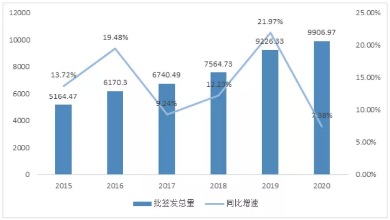 自2007年起,我國將所有已批準上市的血液制品納入生物制品批簽發管理。根據中檢所數據,2015-2020年,我國血液制品批簽發量呈逐年上升趨勢,增速波動較大。2020年,我國血液制品批簽發總量為9906.97萬瓶,較2019年同比增長7.38%,受疫情影響,批簽發總量增速大幅下降。