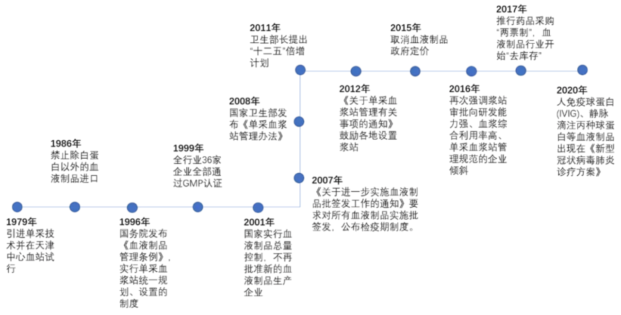 我國血液制品行業發展最早可以追溯到1979年引進單采技術并在天津中心血站試行,1996年國家發布了《血液制品管理條例》,對單采血漿站實行統一管理,血液制品行業經歷了一段積極探索與嚴格監管時期;2011年,衛生部長提出倍增計劃,在接下來幾年里,政府鼓勵各地設置血漿站,并取消了血液制品政府定價,血液制品行業經歷了一段鼓勵發展時期;2017年開始政府推行藥品采購“兩票制”,減少流通環節,血液制品行業開始去庫存。2020年初疫情爆發,血液制品在新冠肺炎治療中發揮了重要作用,血液制品行業迎來新的發展階段。
