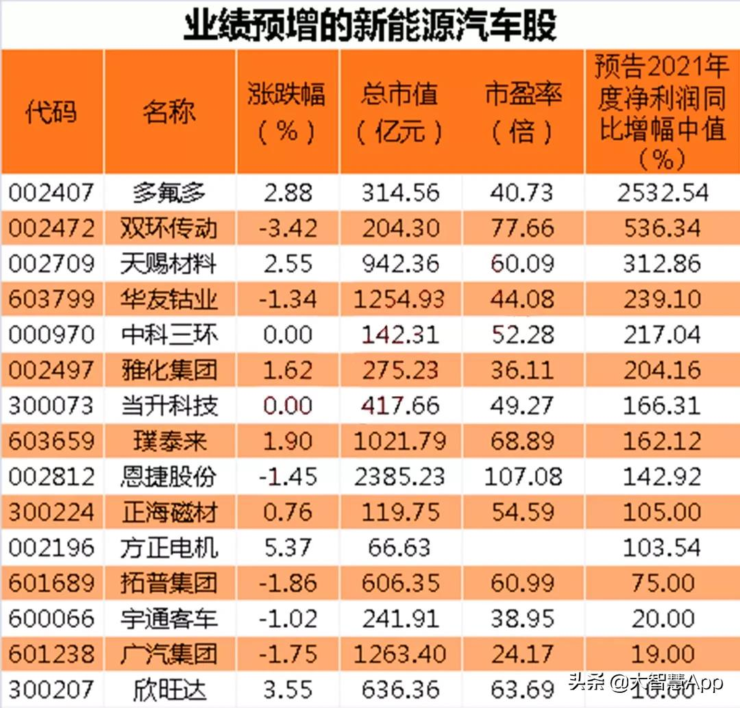 統計顯示,截止上周,新能源汽車概念股中已有15股公布2021年度業績預告,均為預增,從預計凈利潤同比增幅來看,、傳動、預計增幅居前,分別為2532.54%、536.34%、312.86%。