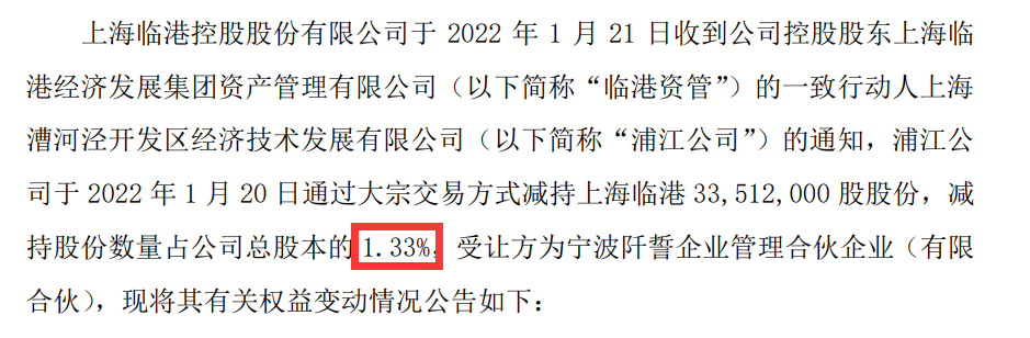 根據上海臨港公告,該公司控股股東臨港資管的一致行動人上海漕河涇開發區經濟技術發展有限公司,通過大宗交易方式向寧波阡誓企業管理合伙企業(有限合伙)(下稱:寧波阡誓)轉讓該公司1.33%股份。