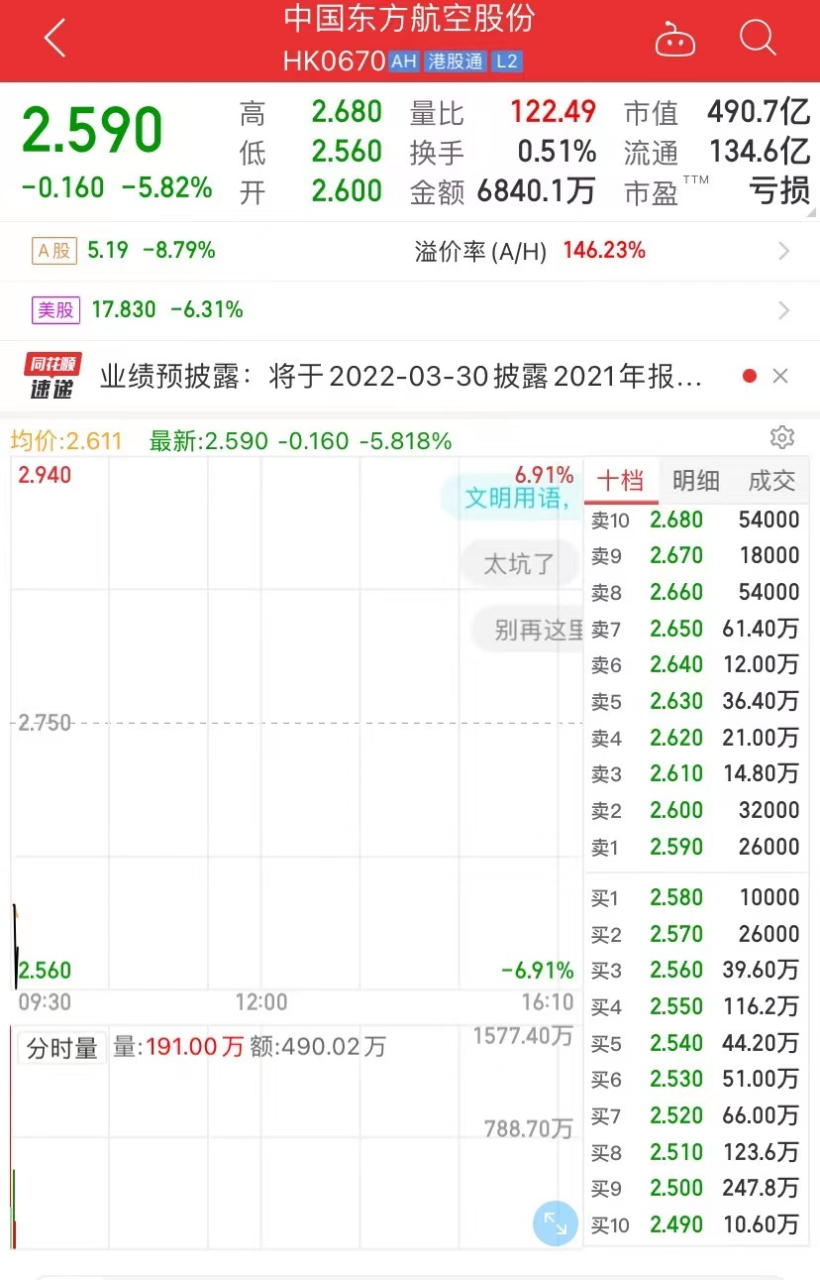 3月22日,中國東航A股競價期間一度跌至5.12元,跌幅達到10%,東航港股也出現低開,報價2.630元,跌幅超4%。截至發稿,開盤后中國東航A股最高跌幅超9%。