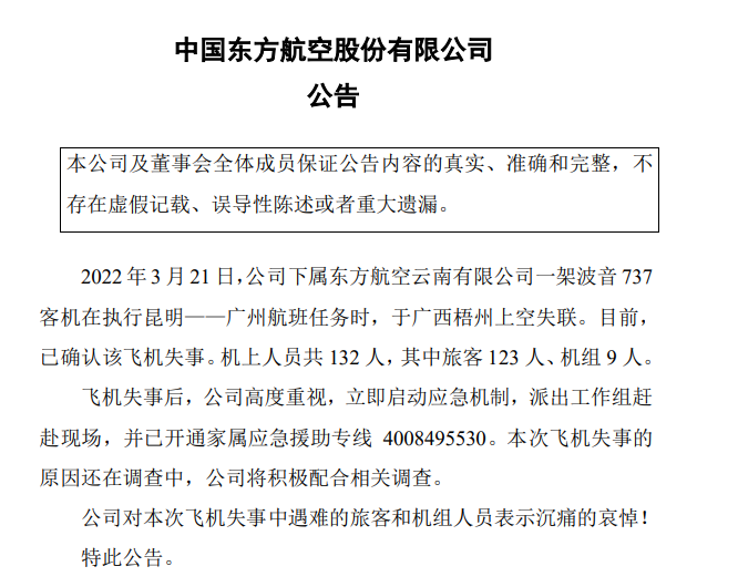 東航也在3月21日下午發布公告稱,飛機失事后,公司高度重視,立即啟動應急機制,派出工作組趕赴現場,并已開通家屬應急援助專線。本次飛機失事的原因還在調查中,公司將積極配合相關調查。公司對本次飛機失事中遇難的旅客和機組人員表示沉痛的哀悼!