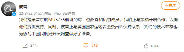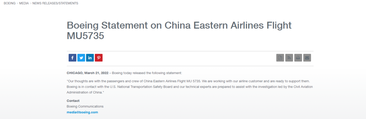 3月21日,波音公司就向媒體表示,正在收集更多信息。3月22日凌晨,波音發文稱:“我們掛念著東航MU5735航班的每一位乘客和機組成員。我們正與東航開展合作,以向他們提供支持。同時,波音正與美國國家運輸安全委員會保持聯系,我們的技術專家也為協助中國民航局開展調查做好了準備。”