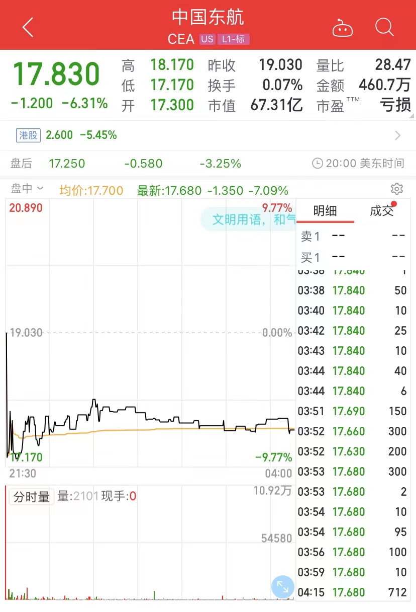 3月21日下午,東航港股也短暫出現斷崖式下跌,美股周一盤前跌超15%;
