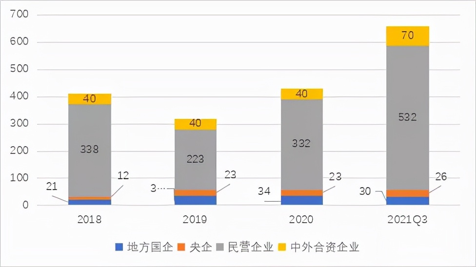 其中,央企和地方國企的數據一直都很穩定,2018年-2020年三年間,央企通過員工持股方案的分別有12家、23家和23家,地方國企分別有21家、34家和34家。這和央企及地方國企在實施員工持股方案時,受到更嚴格的監管政策是分不開的。